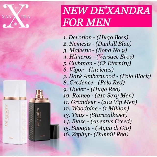 Dexandra, paling top, paling laris, diminati, dexandra dunhill blue, dexandra hugo boss. De'xandra for him/her men/lady perfume 100ml minyak wangi lelaki/perempuan black now / one direction dexandra ck victoria secret. Kat sini, saya nak share 10 bau yang top selling for him & for her. Berminat pm/whatsapp azzy dexandra : De'xandra for her & him.