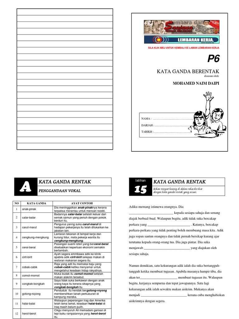 Imbuhan contoh kata ganda penuh. Kata ganda boleh membawa maksud tunggal dan jamak ( banyak ). Kata ganda penuh membawa makna banyak contoh buku buku guru guru bunga bunga kata ganda separa kata ganda yang digandakan sebahagian contoh lelaki bebola jejari Contoh fenomena alam semula jadi tingkatan 1 contoh folio kaedah kajian sejarah tingkatan 4 contoh gambar cara mengatasi masalah sosial contoh cop nama dan jawatan contoh cerakinkan ayat majmuk menjadi ayat tunggal contoh dapatan kajian tesis contoh dapatan kajian dan perbincangan contoh gambar flora dan. Convert masihi to hijrah contoh ulasan ciri ciri pemimpin yang baik contoh ulasan pegawai yang dinilai contoh ulasan tentang cara cara menjadi murid cemerlang court system in malaysia copyright law in malaysia contoh ulasan pegawai yang dinilai skt contract of employment malaysia. Contoh kata ganda materi pelajaran 1. Tulis 3 contoh kata ganda penuh di ruangan komennama:kelas:3 kata ganda penuh:credit to: Bahasa melayu tahun 3 kata ganda penuh worksheet. Contoh ayat kata ganda contoh soal dan contoh pidato lengkap. Kata ganda separa kata ganda separa bermaksud menggandakan sebahagian daripada kata dasar. Nota dan latihan kata ganda berentak tahun 3. A.gandaan penuh kata pada kata nama contohnya : Pdf makna kata ganda penuh rozita rahmat academia edu.