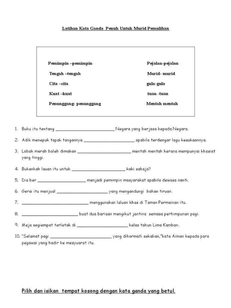 Kata ganda ialah proses pengulangan kata secara keseluruhan atau pada. Kata ganda penuh kata ganda penuh ialah kata dasar yang diulang sepenuhnya tanpa perubahan bunyi atau bentuk. Nota dan latihan kata ganda berentak tahun 3. Contoh kata ganda materi pelajaran 1. Gambar kata ganda penuh cikimm com. 1) kata ganda seluruh / penuh. Kata ganda penuh interactive exercise. 1) digunakan pada kata dasar yang diulang atau digandakan seluruhnya. Ada banyak buku buku bagus yang dijual di toko tersebut. Contoh penggunan kata ganda separa dalam ayat. Ialah kata dasar yang digandakan seluruhnya. Contoh ayat kata ganda contoh soal dan contoh pidato lengkap. A.gandaan penuh kata pada kata nama contohnya :